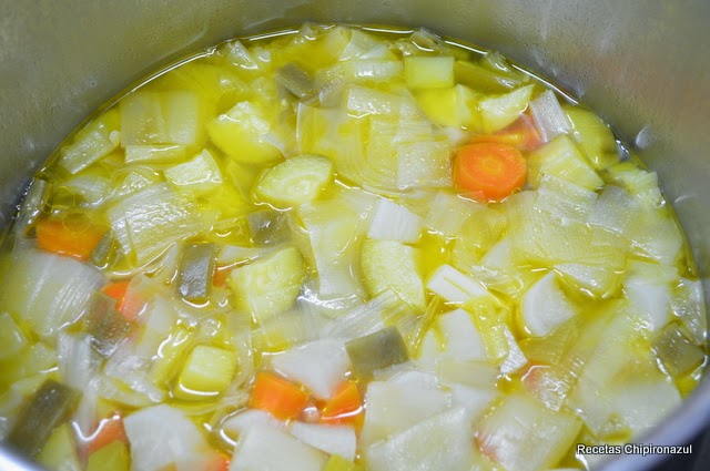 Agrega agua a la olla sólo hasta que cubra las verduras y echa sal a gusto.