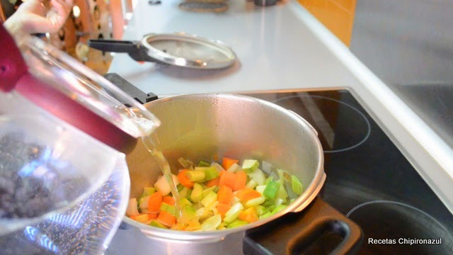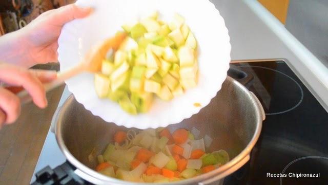 Calienta el aceite de oliva en la olla e introduce las verduras para rehogar. Tapa la olla parcialmente para que la verdura se ablande más rápido.