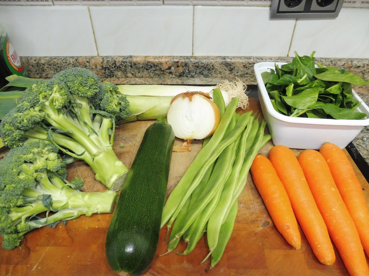 Añadir todas las verduras (tronco del brócoli,zanahorias,calabacín y judías)y cocer durante 25 min aproximadamente a excepción de los brotes o flores del brócoli y las espinacas, ésto lo hacemos para que no pierdan sus propiedades durante la cocción (tan solo necesitan 4/5 min max).