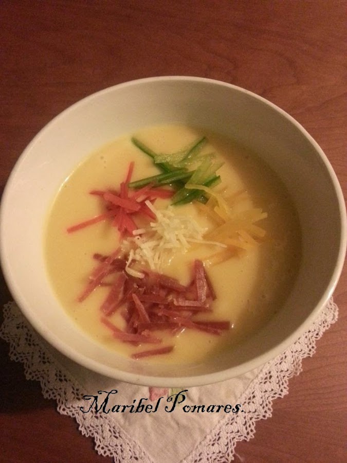 Lo servimos en un bol acompañado de pimiento rojo, verde, amarillo, jamón serrano en juliana y queso rallado bajo en grasas. Yo lo he tomado sin jamón ni queso.