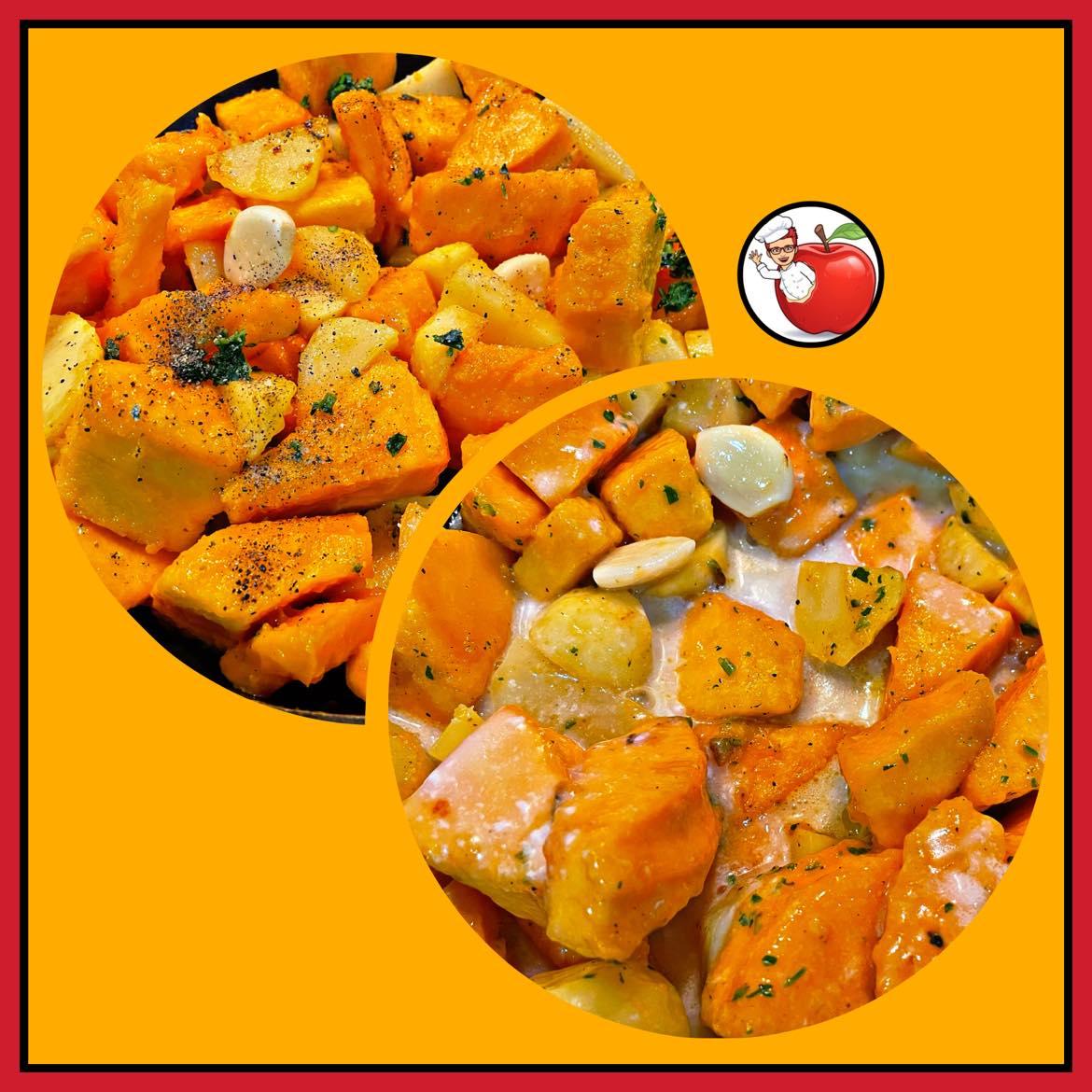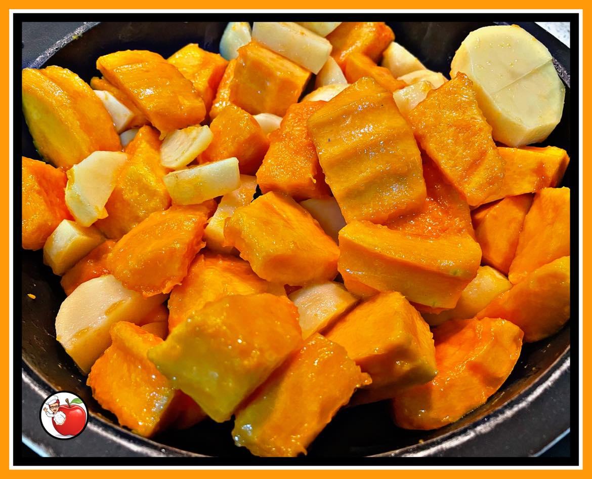 Pelamos y lavamos la calabaza y la cortamos en dados, y hacemos lo mismo con las patatas.
