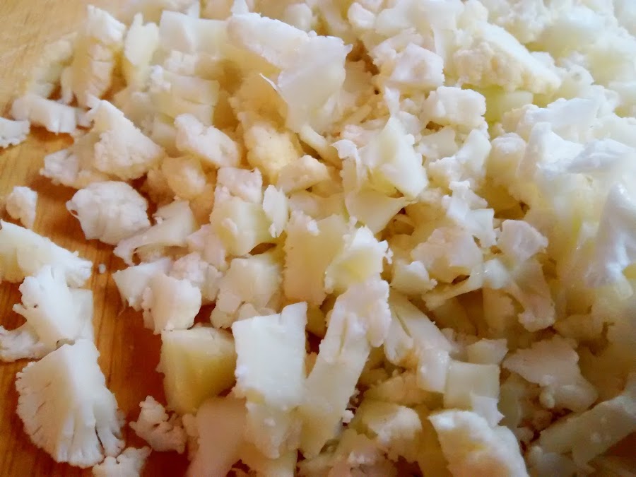 Lavar muy bien la coliflor y picar en trocitos pequeños, puede hacerse con el cuchillo o con la ayuda de una máquina picadora. Hacer este mismo procedimiento con el diente de ajo y dejarlos unidos (coliflor y ajo) en un mismo recipiente.
