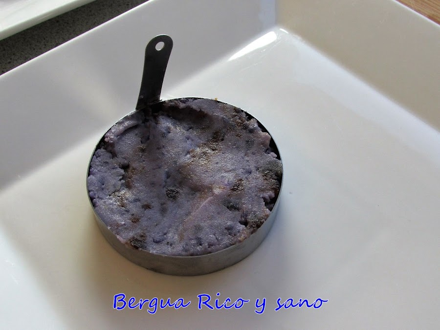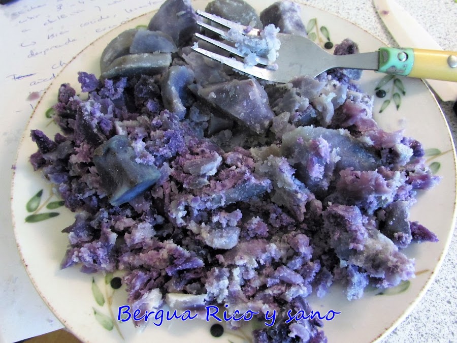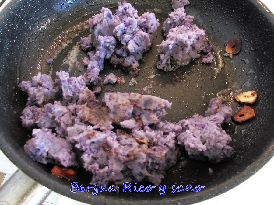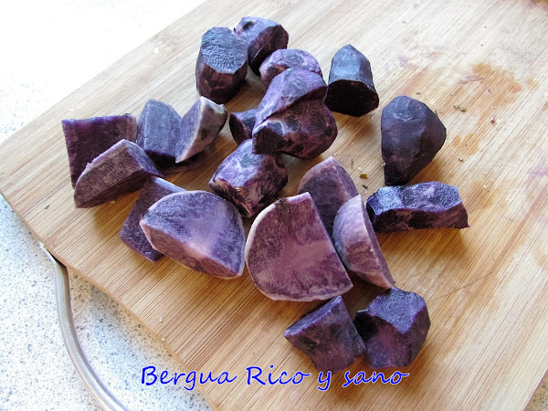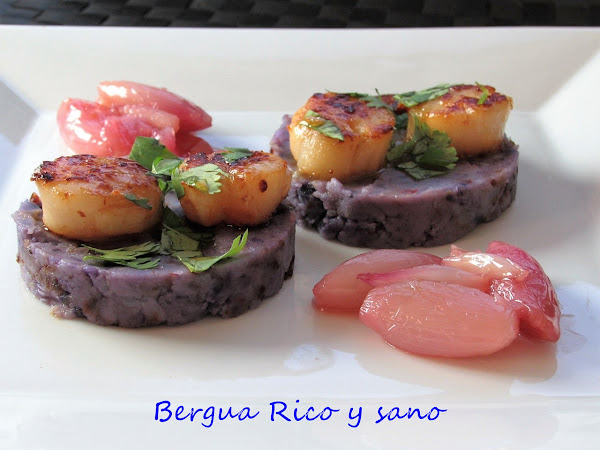 No me cabía todo en el título, pero para ser justos, el plato consiste en puré de patata violeta, vieiras al ajillo y cebollitas chalota caramelizadas en zumo de lima. Obviamente, el puré se puede hacer con patata amarilla también, claro que el violeta añade un toque especial visualmente que juega con el rosita de las chalotas caramelizadas. Para 2 comensales:
