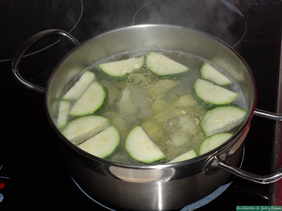 Cuando veamos que la verdura está tierna (lo iremos comprobando cada poco, sobre todo la patata), retiramos del fuego y sacamos las verduras al vaso de la batidora.