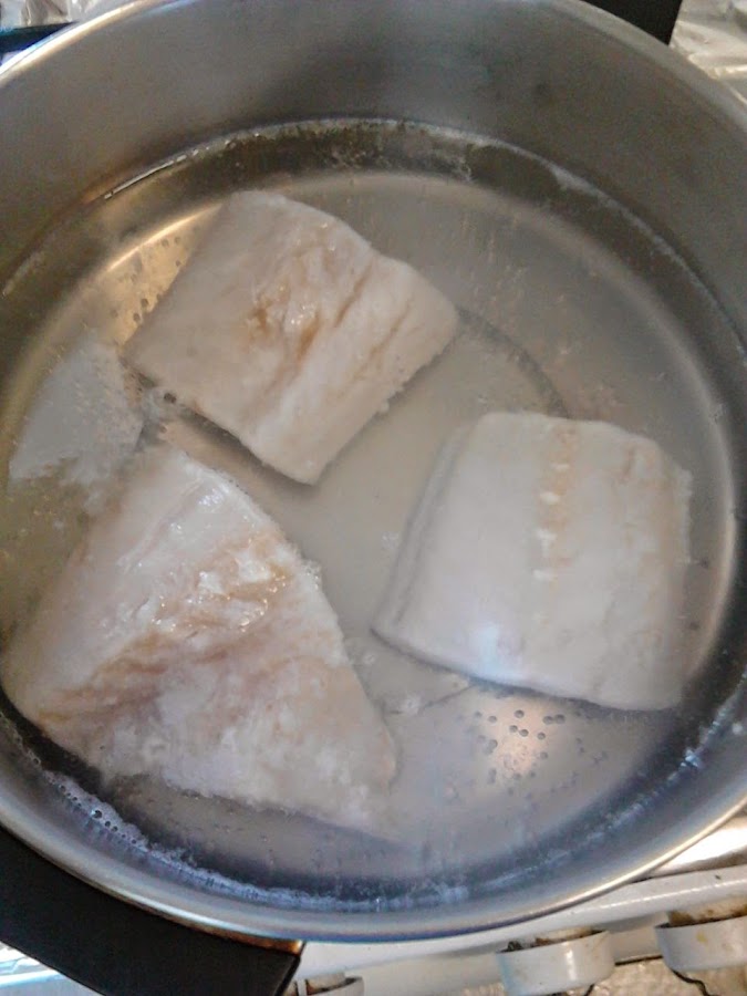 Ahora, en otro fuego. vamos a escaldar o cocinar el bacalao: Ponemos una olla amplia con agua al fuego fuerte. Cuando el agua esté hirviendo, ponemos los 3 lomos de bacalao escurridos y los tenemos cocinando durante 5 ó 6 minutos, hasta que los veamos cocinados y blanquecinos. Cuando veamos que se despega de su piel, lo retiramos a una bandeja escurriendo con la "paleta" o "rasera".