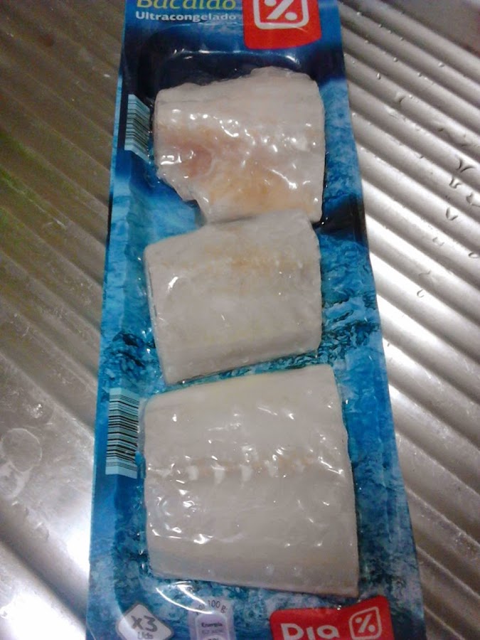 La noche anterior, sacamos los lomos de bacalao (yo he elegido la marca DIA, pero pueden ser Pescanova o cualquier otra) y los ponemos en un táper hondo y amplio en el frigorífico para que se descongelen. El bacalao requiere pocas normas, pero es delicado; por lo tanto: NUNCA DESCONGELAR EN MICROONDAS.
