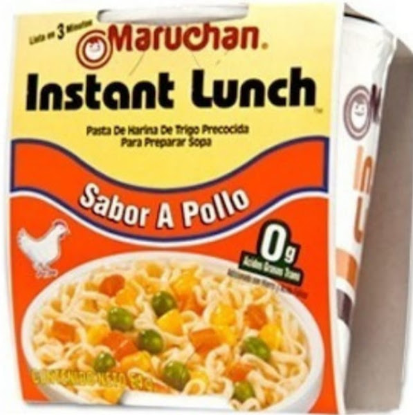 Una sopa instantánea Maruchan sabor a pollo contiene: harina de trigo, minerales y vitaminas (niacina, hierro reducido, mononitrado de tiamina, riboflavina, ácido fólico), aceite vegetal (canola, semilla de algodón, palma), sal, vegetales deshidratados (zanahoria, maíz, chícharos, ajo, cebolla, tallo de apio) , maltodextrina (un tipo de azúcar), glutamato monosódico (un tipo de sal), azúcar, maíz, trigo y proteína de soya hidrilizados.