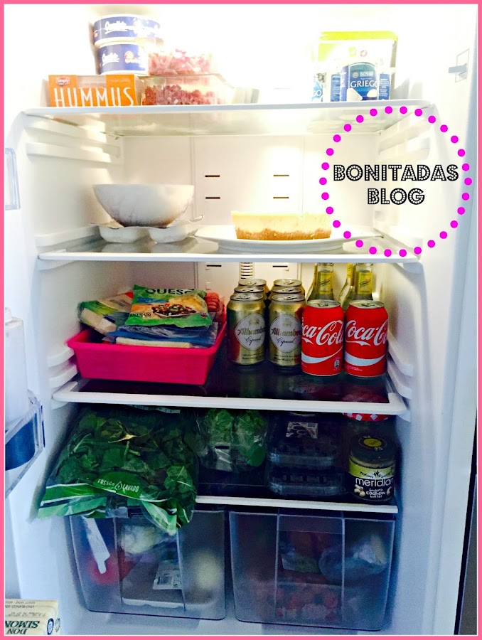 En esta foto podéis ver mejor la balda de abajo y los cajones, que es donde guardo la verdura -la fruta la tengo fuera del frigorífico porque no me gusta nada comerla fría-. Siempre tengo espinacas, berenjenas, calabacines, cebollas, apio, tomates, pimientos, lechuga, pepinos, zanahorias... Todo lo que me sirva para hacer ensaladas, pisto, tabulé, green smoothies y cualquier cosa que lleve verduras. Me encanta.