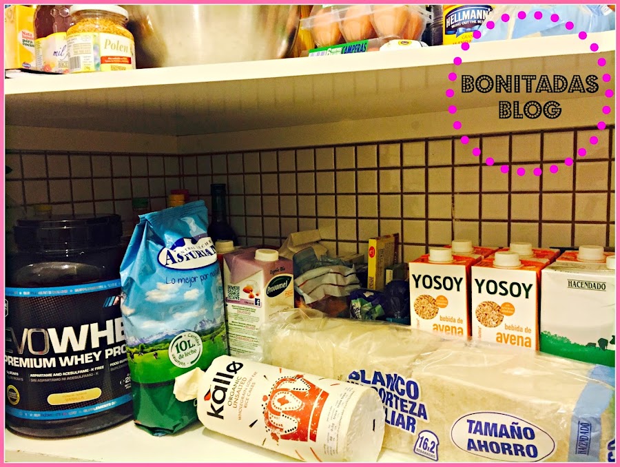 También tengo siempre proteína en polvo, leche de varios tipos (normal, vegetal, en polvo porque la normal se me echa a perder a veces...), pan de molde, tortitas de arroz, aceite de oliva y girasol, vinagre de Jerez y de manzana... Y lo que no se ve es harina, azúcar, caldo concentrado y esas cosas que no quiero que vea una nutricionista que tengo por amiga (va por ti, N!!! Jajajaja).