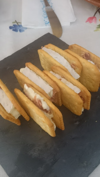 Ingredientes: Galletitas saladas, yo pongo las Tuc, una cuña de queso brie, 50grs de jamón ibérico picado. Preparación: Abriremos la cuña de queso por la mitad, pondremos el jamón picado en medio en una mitad y taparemos con la otra mitad Iremos cortando lonchas y poniéndolas entre dos galletitas, listo para comer.