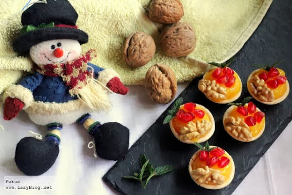De postre os propongo dos recetas ligeras para no pasarnos. Podéis servir unos pastelitos de lemon curd con granadas y nueces, suaves y pequeñitos, de tamaño bocado, y todos los tomarán encantados. Además, podéis servir algo fresquito, como un postre para beber. Os recomiendo el sorbete de mandarina con vodka que os sorprenderá y os entonará esta nochevieja.
