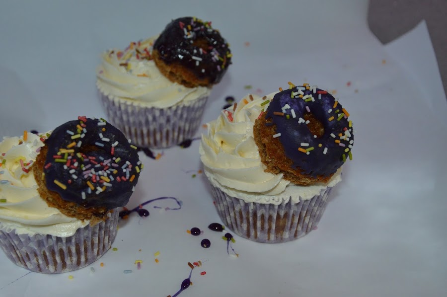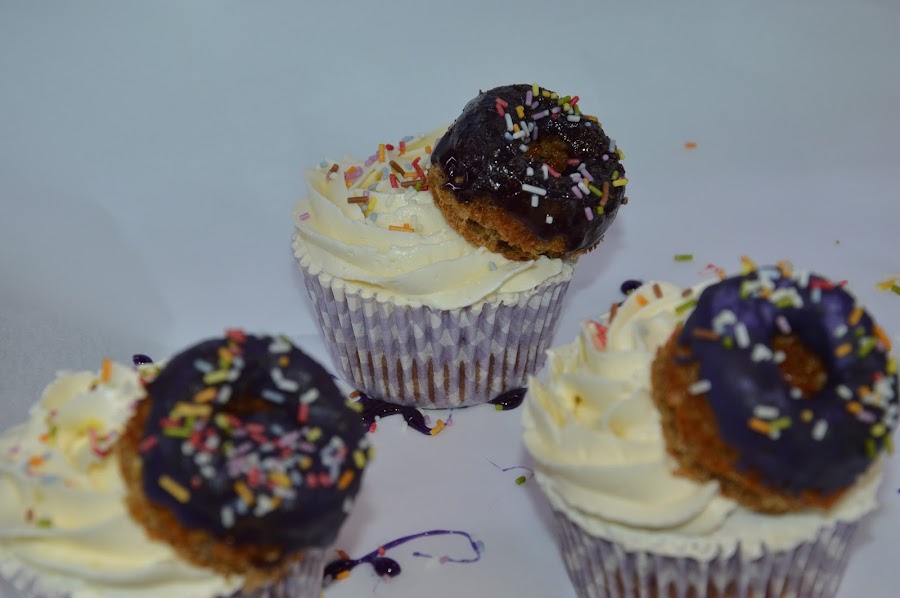 Empezamos por preparar los mini Donuts. Precalienta el horno en 180°C y engrasa la bandeja de los mini Donuts ( la podéis encontrar en cualquier tienda de reposteria). En un bol, tamizado la harina con la levadura y la canela. Añade el azúcar y reserva. En otro bol mezcla bien la leche, el huevo y el aceite. Incorpora a los ingredientes secos y remueve bien hasta obtener una mezcla homogénea. Reparte en la bandeja de los mini Donuts con ayuda de una manga pastelera ( importante no llenar más de la mitad del molde). Hornea unos 12 minutos o hasta que estén dorado tos. Deja enfriar sobre una rejilla. Prepara los cupcakes. Tamizado juntos la harina, la levadura, la canela y la nuez moscada. Reserva. En una jarra, mezcla el resto de ingredientes. Añadelos poco a poco a los ingredientes secos y remueve bien para que no haya grumos
