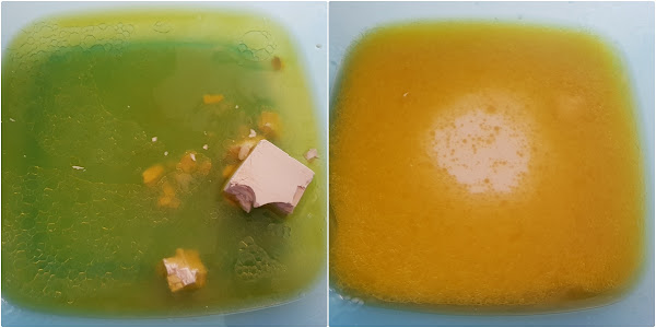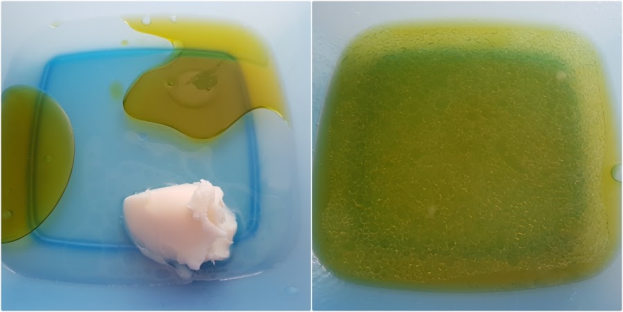1. - Ponemos en un bol o amasadora, el agua, el aceite y la manteca y mezclamos durante 2 minutos, que quede todo bien integrado.