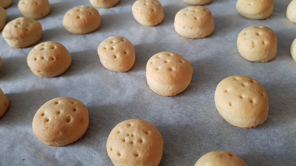 8. - Encendemos el horno a 190º o 180º si tenemos turbo. Y cuando esté bien caliente, metemos las galletas 15 minutos. Bajamos entonces a 170º el horno y dejamos 5 minutos más, o hasta que estén doradas, con cuidado de que no se quemen. Probamos una para comprobar que el centro está crujiente.
