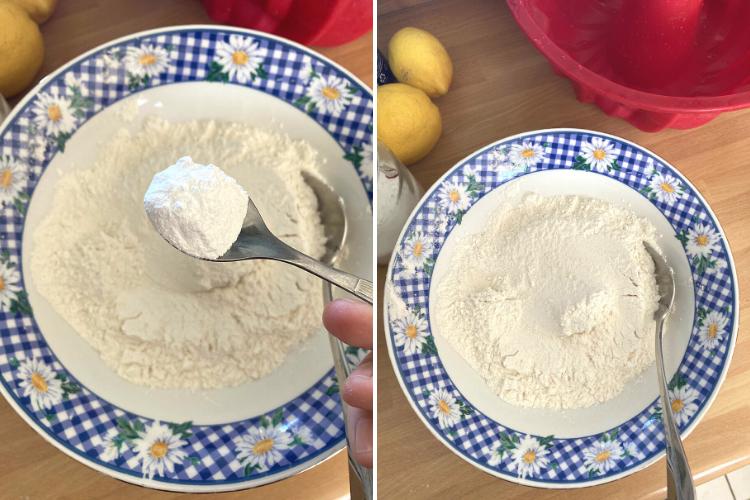 En un bol cernir la harina (pasar por un colador) y agregar los polvos de hornear y la sal. Mezclar todo bien y reservar.