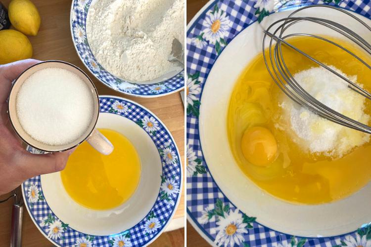 En otro recipiente, con la ayuda de una batidora eléctrica o varilla de mano, agregar la mantequilla (a temperatura ambiente) y el azúcar y comenzar a batir. Ir agregando los huevos uno a uno, con pausas para que se vayan uniendo a la mezcla.