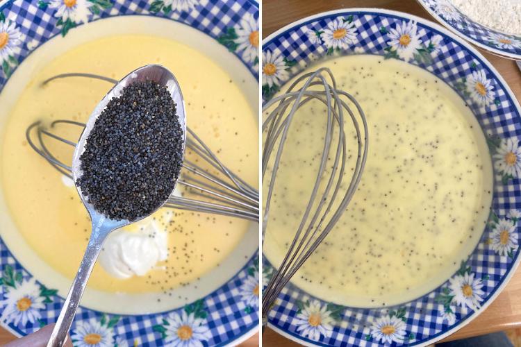 Añadir el yogurt, el jugo y la ralladura de limón y mezclar todo muy bien. Opcionalmente agregar las semillas de amapolas