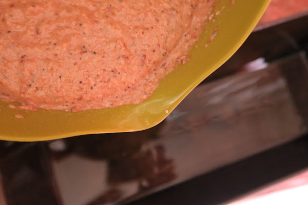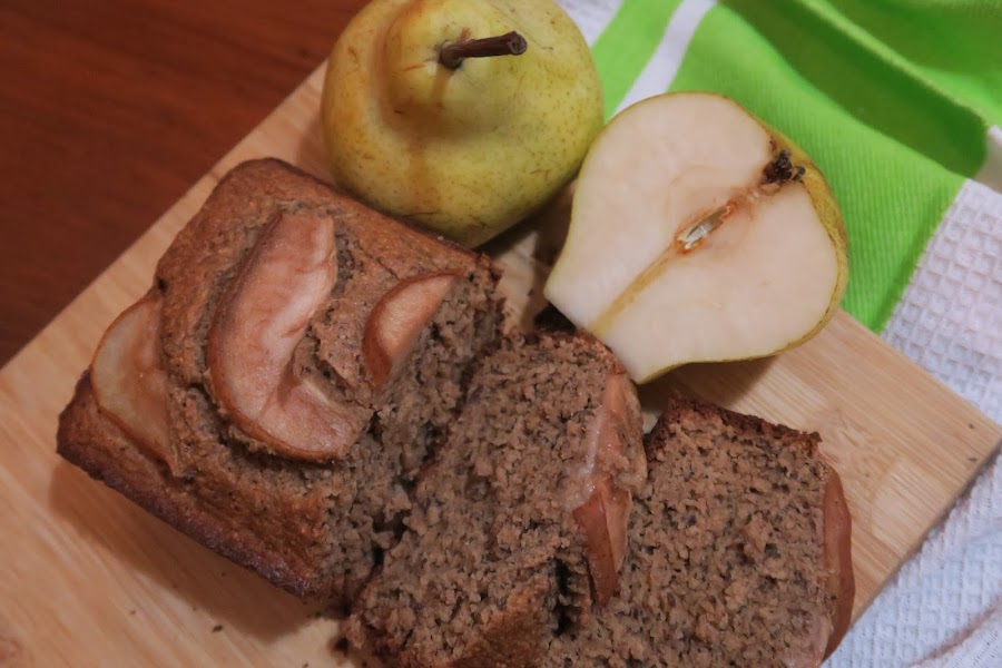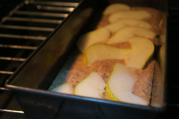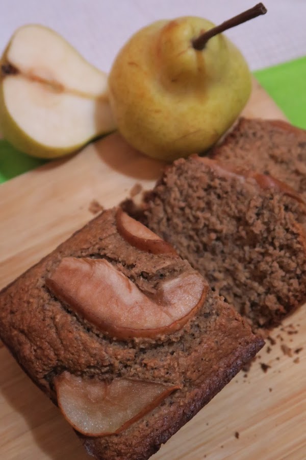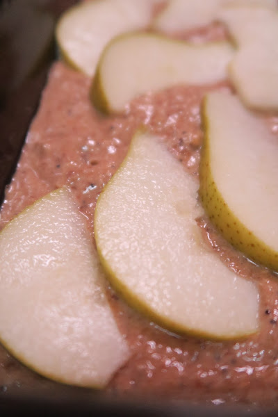 Cortar 1/2 pera en rodajas (yo les dejé la cáscara) y poner sobre la mezcla, como decoración.