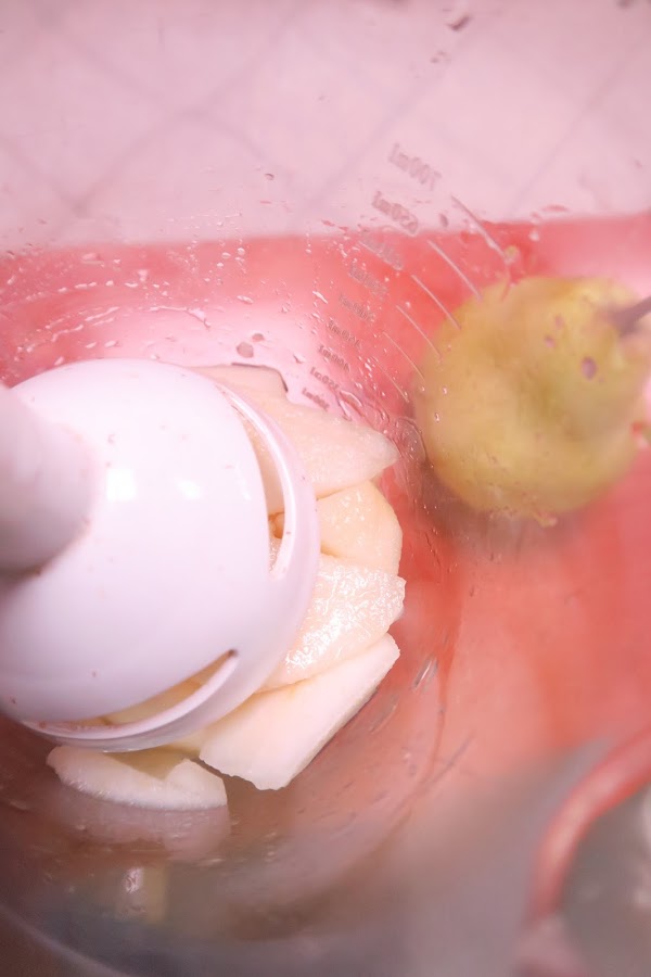Aparte, en la minipimer, añadir 2 peras peladas y cortadas en trozos medianos. Moler hasta lograr un puré.