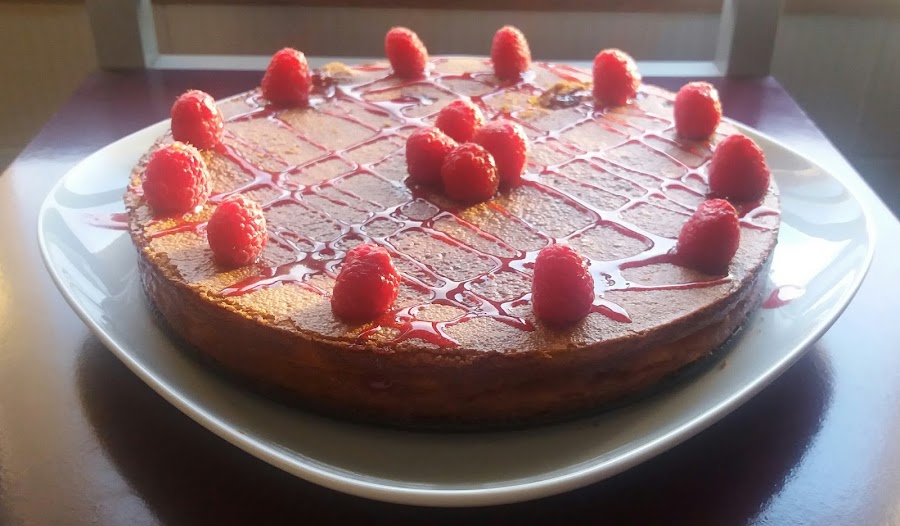 Retiramos del horno y, cuando esté fría, desmoldamos y decoramos con el sirope y las frambuesas.