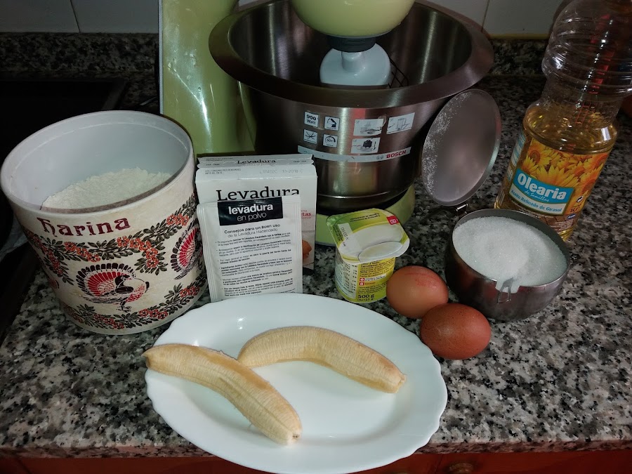 Pelamos y trituramos los plátanos con la ayuda de un tenedor y reservamos , ahora toca poner los ingredientes en la batidora por este orden,empezamos poniendo los huevos y batimos hasta que doblen el tamaño,ponemos sin dejar de batir ,el yogurt ,el aceite ,el azúcar y el plátano , cuando estén bien integrados todos los ingredientes pondremos poco a poco la mezcla de harina y levadura que teníamos reservada
