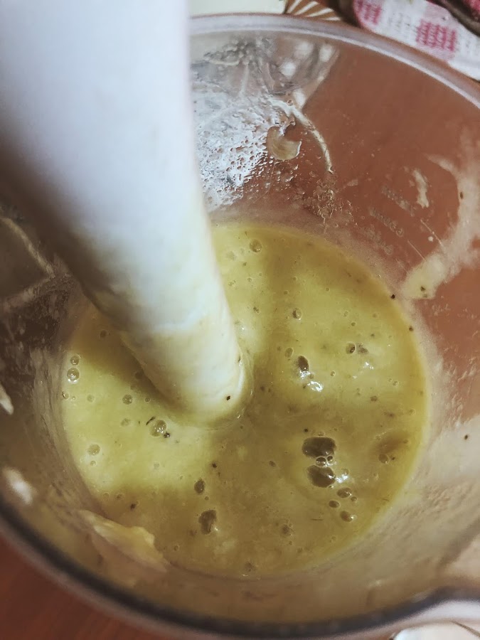 Moler los plátanos en una batidora de inmersión o con ayuda de un tenedor, en lo posible, cuidar de que no queden trozos.