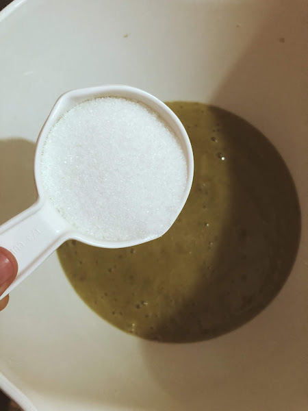 Luego, añadir la harina cernida, con el bicarbonato y el vinagre. Incorporar poco a poco hasta obtener una mezcla homogénea.