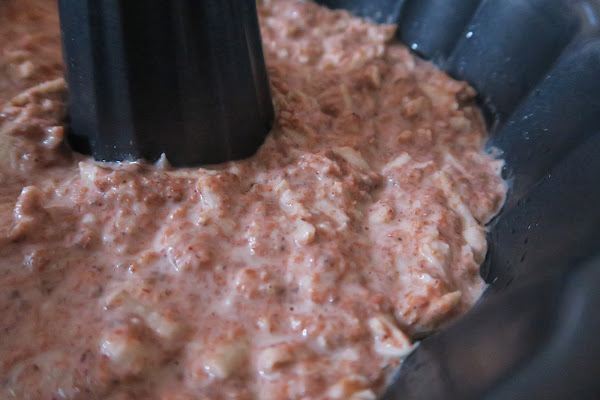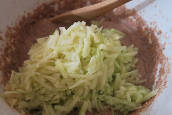 Añadir el agua y luego la harina con los polvos de hornear e incorporar a la mezcla. Finalmente, pelar las manzanas, rallarlas e incorporarlas a la masa con ayuda de una cuchara.