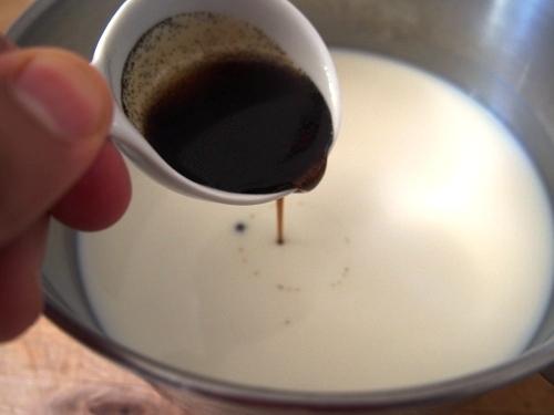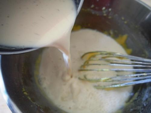Verteremos nuestra leche tibia a la preparación anterior. La incorporaremos en dos tiempos, batiendo entre cada uno. Lo importante una preparación donde todos los ingredientes estén bien incorporados.