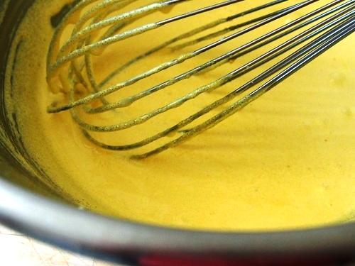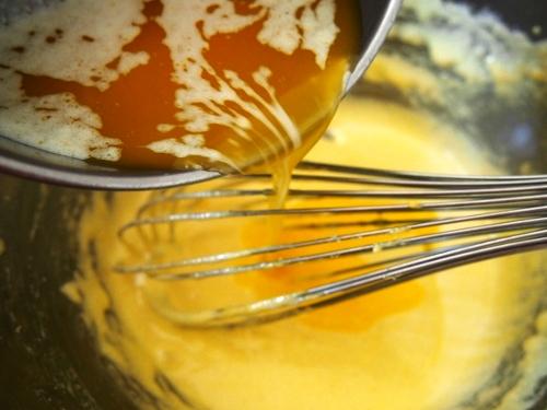 Verteremos la mantequilla derretida de una sola vez y continuaremos con el batidor hasta que esta este completamente integrada.