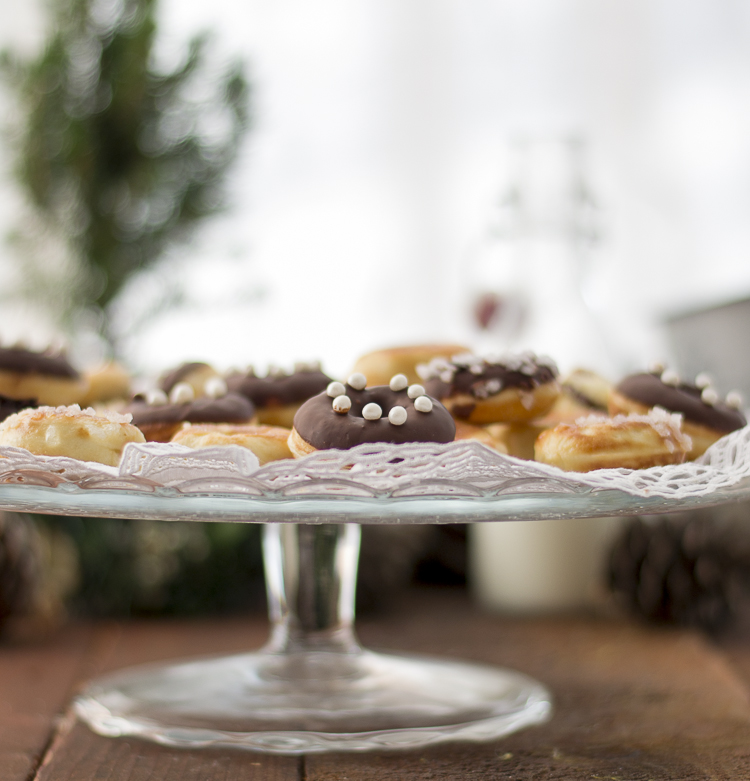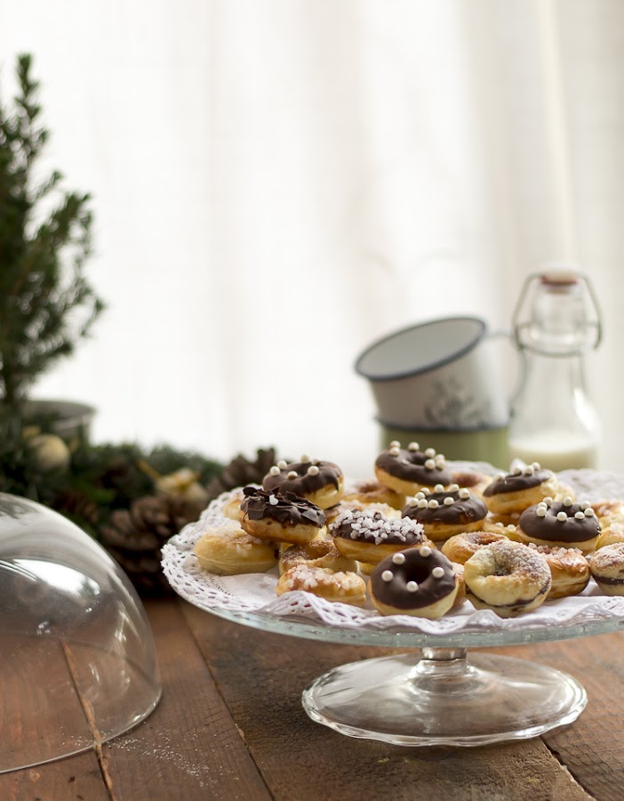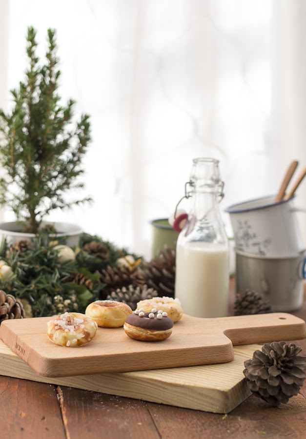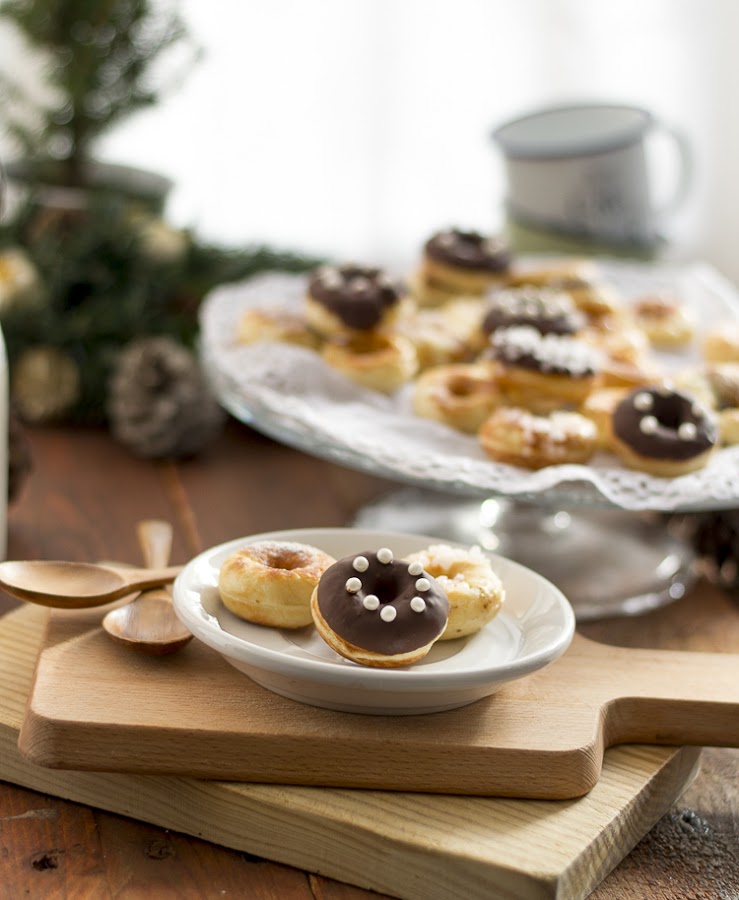 Una vez hayan enfriado, se pueden decorar al gusto, con azúcar glas, con un poco de glaseado y bañandolo en azúcar perlado, o en un baño de chocolate fundido, añadiendo perlitas o almendras fileteadas..... y también se pueden rellenar. Yo he hecho varios rellenos de crema de cacao.