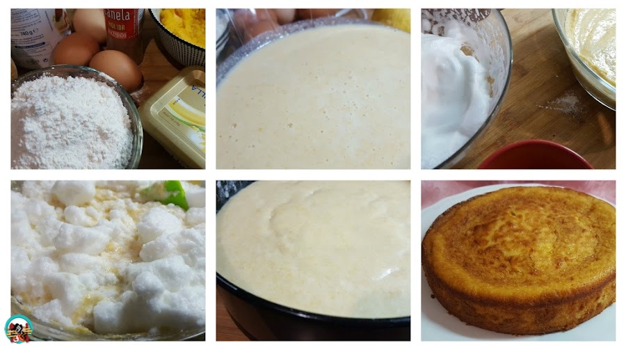 3.- Separamos las claras de las yemas.Batimos las claras a punto nieve con una pizca de sal. Batimos las yemas con el azúcar hasta que estén cremosas y blanquecina. Mezclamos las claras montadas a punto nieve con las yemas con movimientos envolventes. Añadimos la harina tamizada y removemos. Incorporamos la masa de la calabaza y mezclamos bien.
