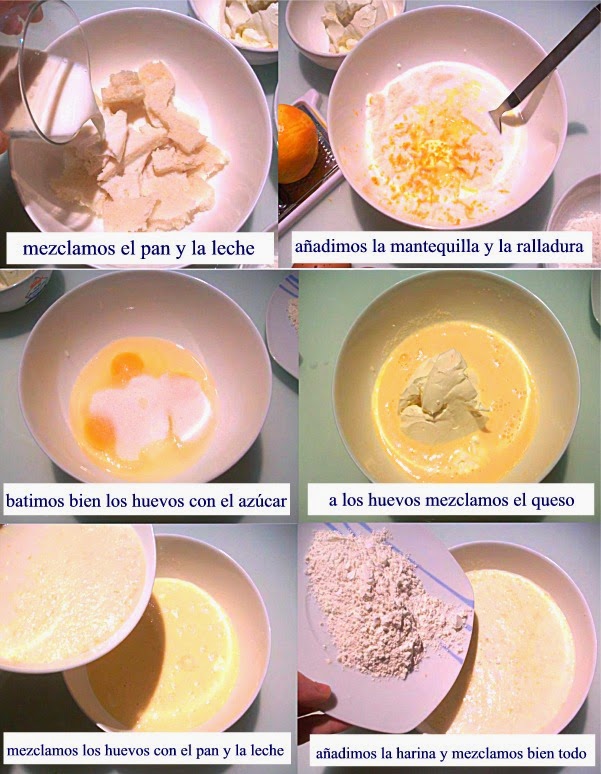 Finalmente mezclamos las dos preparaciones, la de los huevos con el azúcar y la del pan con la leche. Si nos quedan grumos le pasamos un momento la batidora o las varillas. Queda una masa bastante líquida.