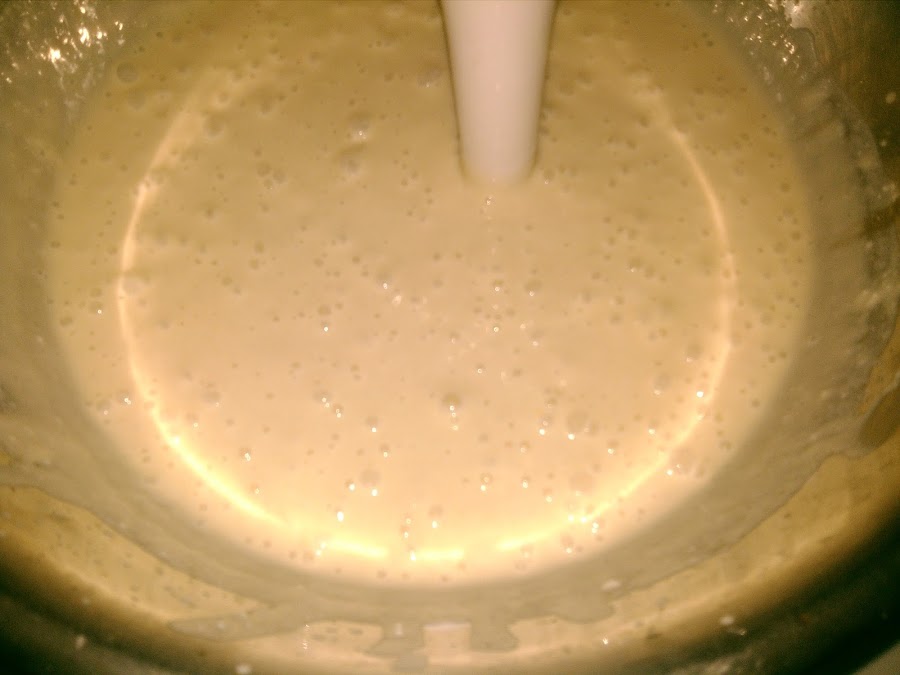 Agregar el harina y una cucharadita de polvos de hornear y luego la leche.