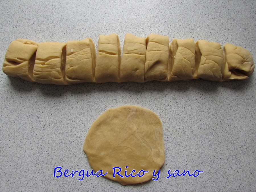 7. Cuando la masa haya doblado su tamaño, la desgasificamos (presionamos con las manos para deshacernos del exceso de aire). Entonces le damos forma de rollo alargado y cortamos en 10-12 trozos.