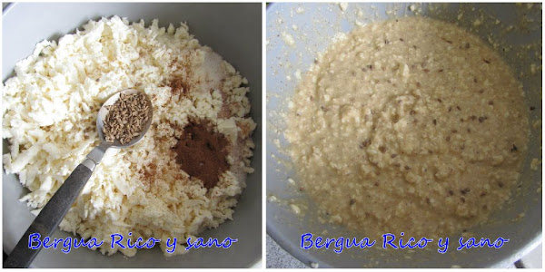 6. Mientras tanto, preparamos el relleno. Rallamos el queso, mezclamos los ingredientes y batimos con un tenedor hasta que quede en una pasta densa. Si es demasiado densa, podemos añadir un poquito de leche y mezclar.