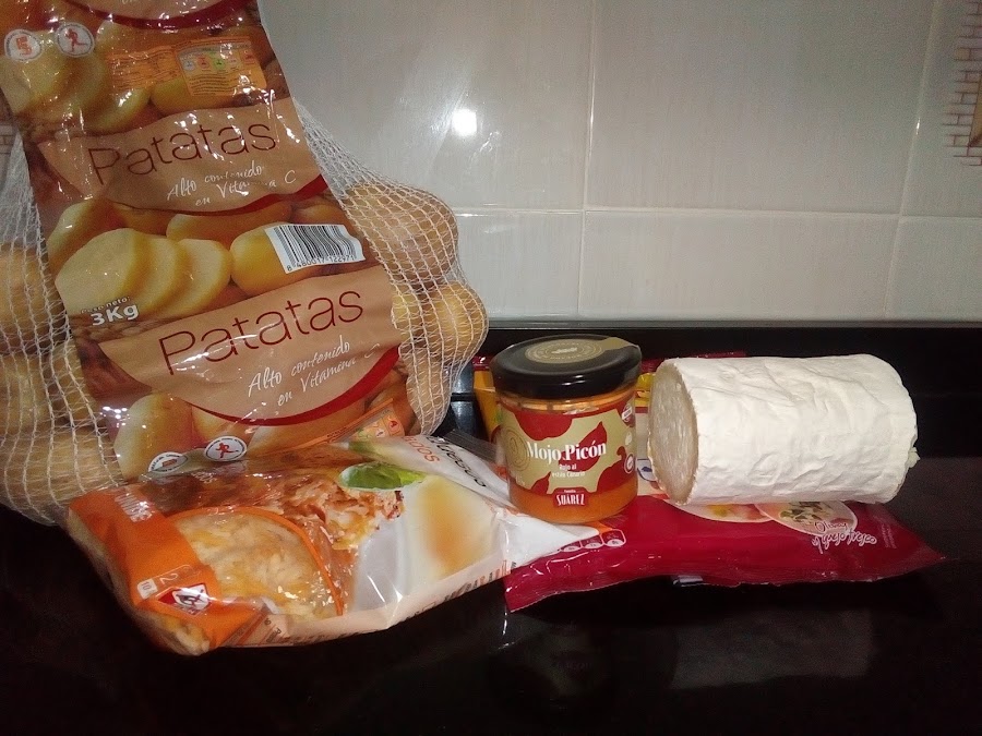 A continuación, colocamos una quesadilla en una sartén grande y le echamos el queso rallado, la patata con el mojo y el queso de cabra desmenuzado por encima. La dejamos un par de minutos hasta que la quesadilla se doré por ese lado y le damos la vuelta para que se haga por el otro.