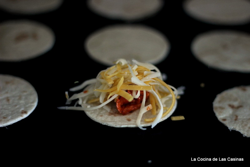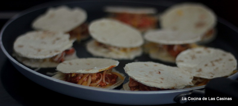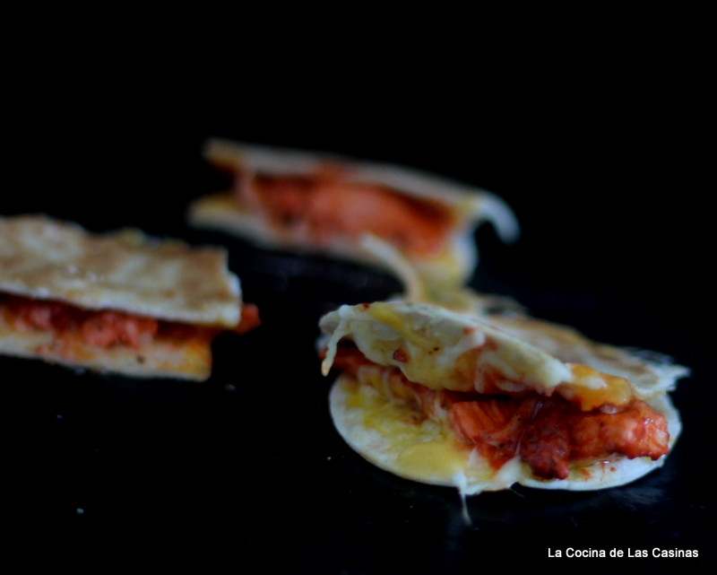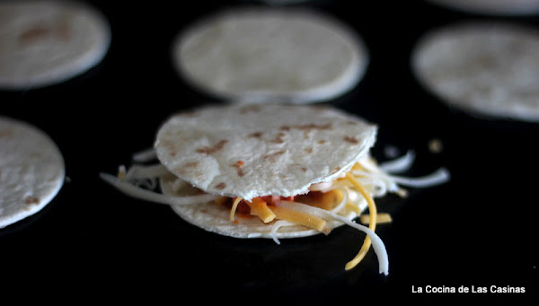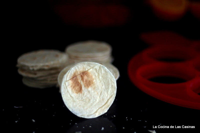 Mientras tanto, si te apetece hacer las quesadilllas minis, deberás recortar las tortillitas con un molde redondo, es un poco pesado pero quedan mucho más apetecibles.