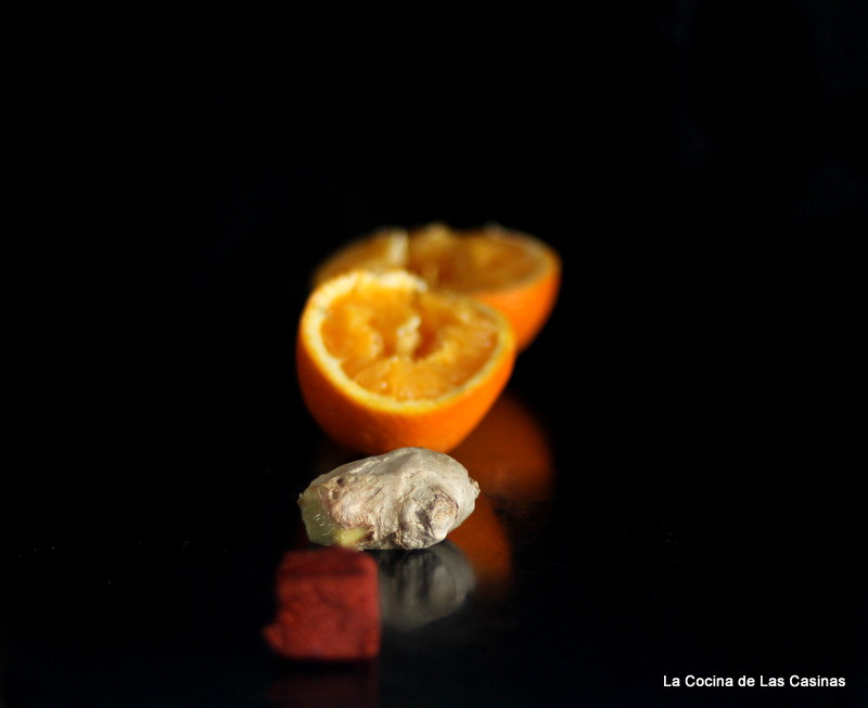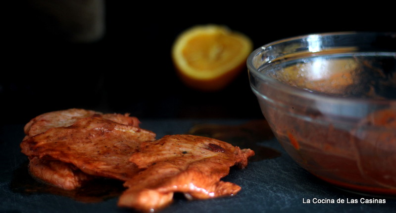 Mezcla el zumo, la pasta de achiote (qué tendrás que deshacer en el líquido con un tenedor o en la batidora), el jengibre cortado muy pequeñito, el vinagre la sal y la pimienta. Cuando se haya deshecho la pasta de achiote incorpora los filetes de pollo, deja macerar en la nevera durante un par de horas. De vez en cuando, dale una vuelta para que se impregnen los filetes por igual.