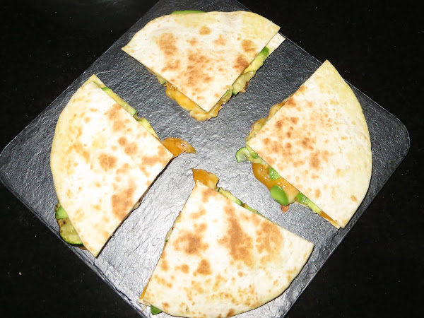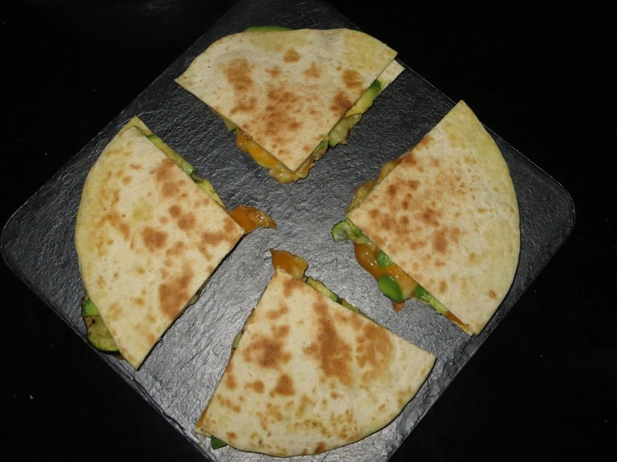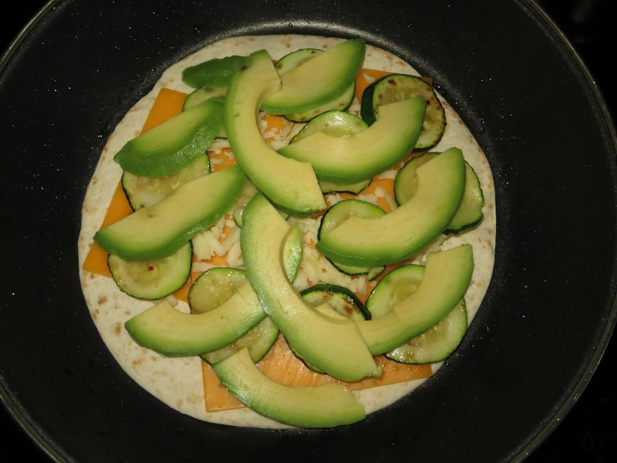 Luego colocáis en una sartén un poco engrasada una tortilla de trigo y encima dos lonchas de queso cheddar, la mozzarella rallada, medio calabacín en lonchas y medio aguacate. Lo tapáis con la otra tortilla de trigo y esperamos hasta que el queso se funda. Luego le damos la vuelta para que la tortilla se haga por el otro lado.