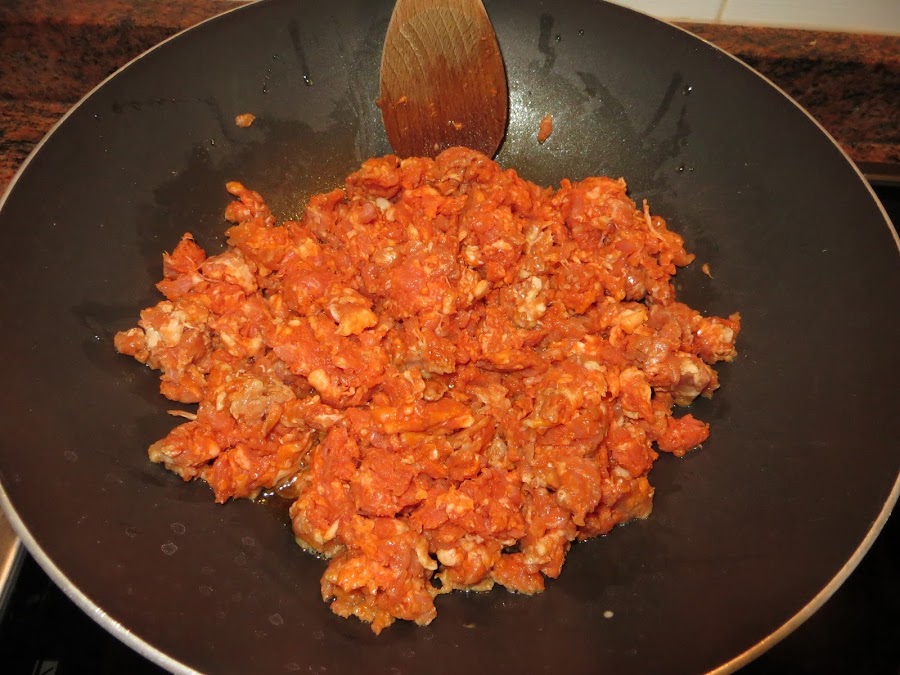 Lo primero que hacemos es echar un pelín de aceite en una sartén y comenzar a dorar el picadillo de chorizo. Echamos muy poco aceite, ya que el chorizo soltará bastante.