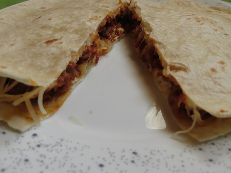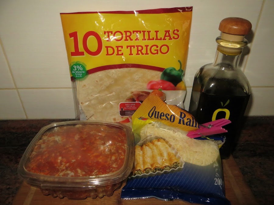Una vez que tenemos dorado el picadillo, lo colocáis encima de una tortilla mejicana y ponemos queso rallado por encima, lo metéis un minuto al microondas o al horno y ya está listo para comer. Un estupendo aperitivo para tomar antes de comer.