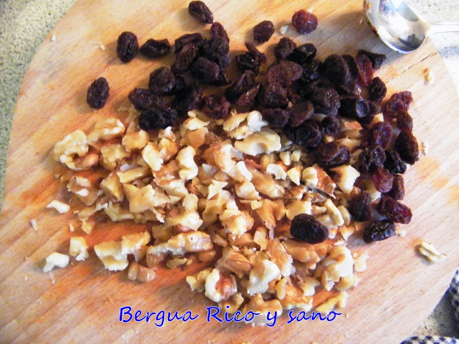 4. Añadimos también las nueces picadas, las pasas, un poco de nuez moscada, un poco de pimienta de cayena y un poco de pimienta negra. Echamos también una cucharada de salsa de soja y mezclamos moviendo durante 2-3 minutos.