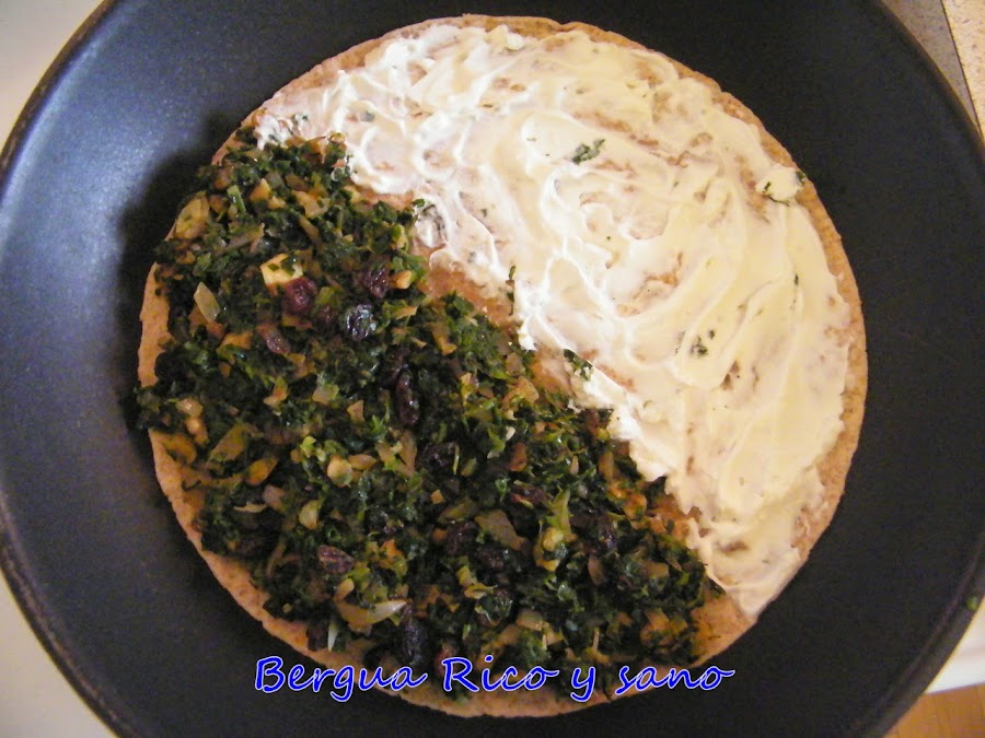 6. En la otra mitad untamos de forma generosa el queso de cabra. Si no usamos queso de untar, sobre las espinacas repartimos el queso en trozos del mismo grosor.