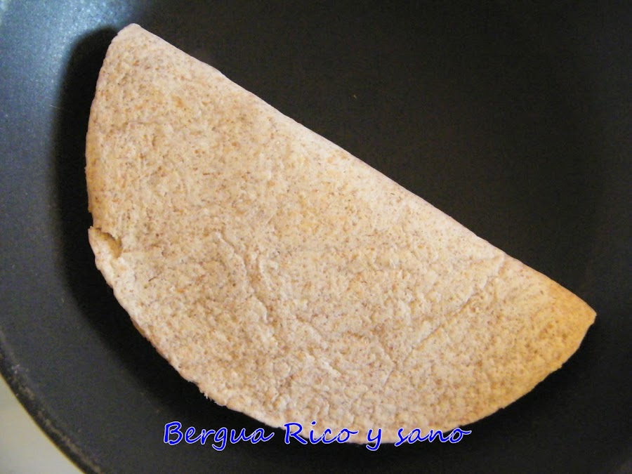 5. En una sartén limpia colocamos la tortilla y en una mitad servimos el relleno mientras dejamos que la tortita se caliente un poco a fuego medio.
