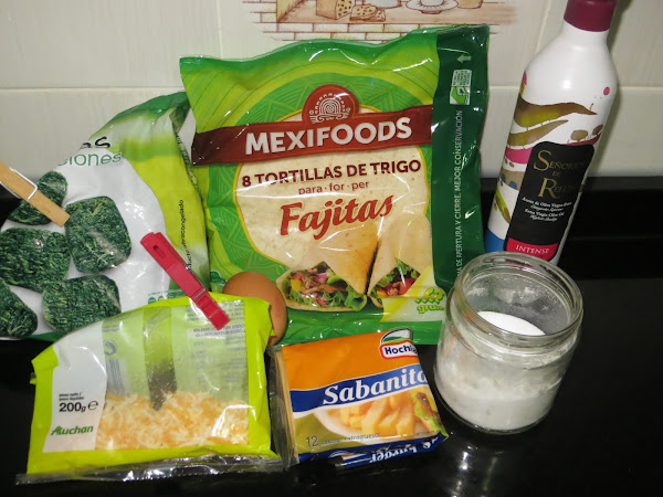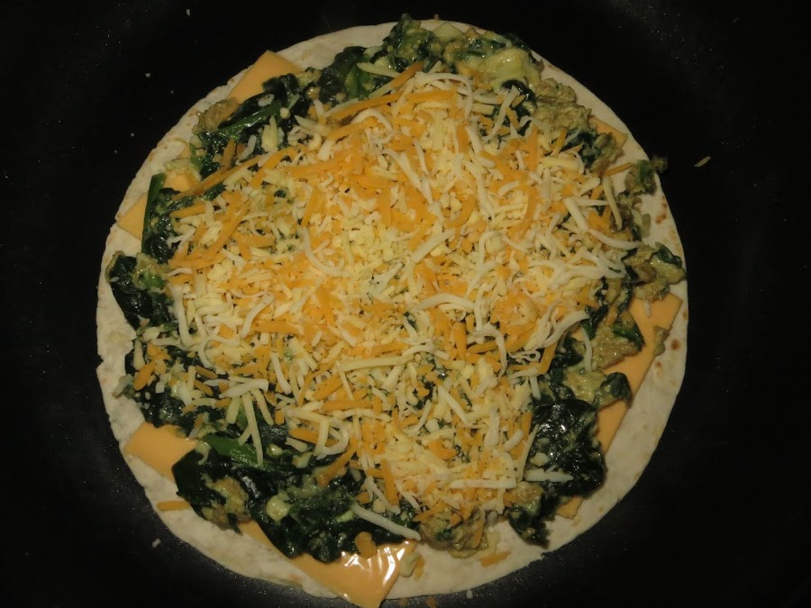 Ahora comenzamos a montar nuestra quesadilla, colocamos una tortilla y las tres lonchas de queso cheddar, encima las espinacas con el huevo y finalmente el queso rallado. La ponemos en una sartén grande o plancha y le damos varias vueltas hasta que el queso esté fundido y ya está lista para comer.