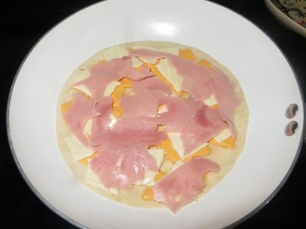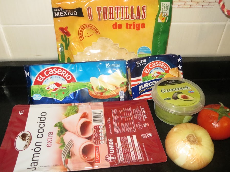 Luego nos ponemos a preparar nuestras quesadillas, colocamos una tortilla de trigo y ponemos encima en trozos dos lonchas de queso cheddar, otras dos de queso blanco y otras dos de jamón de york. La ponemos en una sartén a fuego medio y cuando haya estado un par de minutos le damos la vuelta como si fuera una tortilla y la tenemos otro par de minutos por el otro lado. La sacamos a un plato y le añadimos el pico de gallo por encima y colocamos las dos salsas a su lado para que los comensales vayan mojando. Ahora hacemos lo mismo con nuestra otra quesadilla y ya tenemos preparada nuestra deliciosa cena.