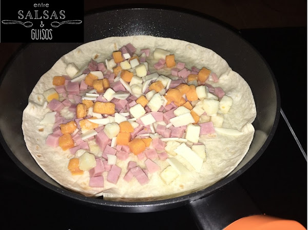 Añade encima el jamón cortado en pequeños tacos y cubre con otra torta. Deja que se haga sobre la sartén unos 2-3 minutos y dale la vuelta para que se haga por la otra parte (yo lo hice como si girase una tortilla de patatas).