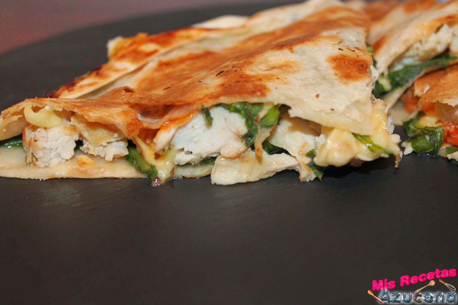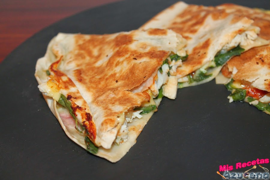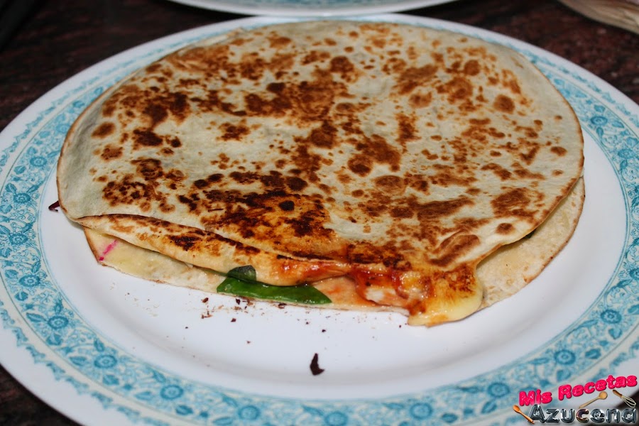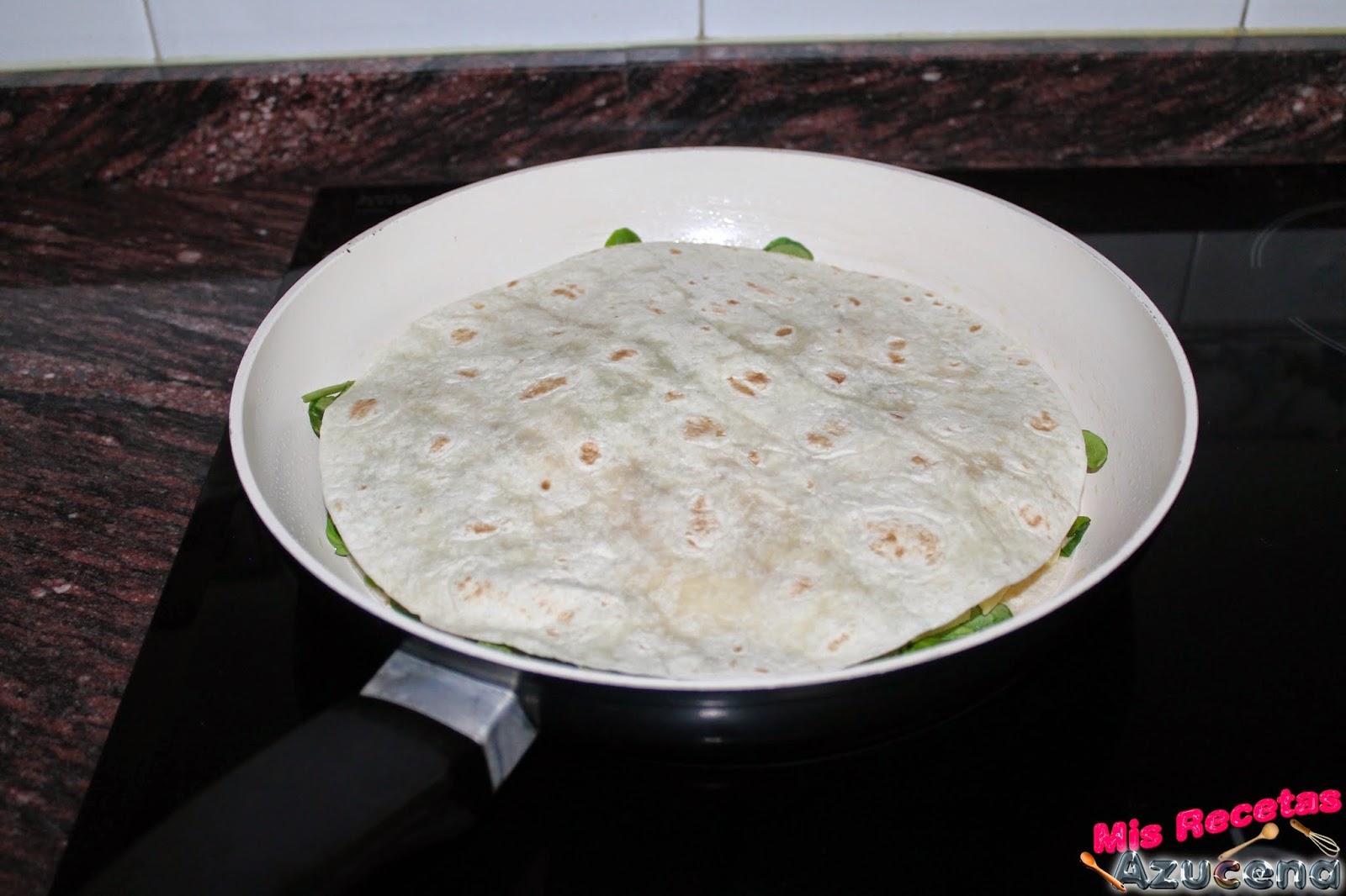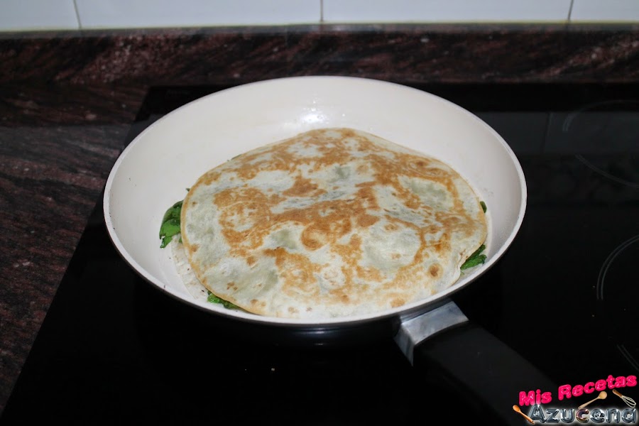 Pasados los 2 minutos añadiremos unos trozos de feta, taparemos con otra tortita y le daremos la vuelta con ayuda de una paleta para dejarla otros 2 minutos por el otro lado pero ahora con ayuda de la paleta presionaremos un poco sobre la tortita para que se ponga pareja.