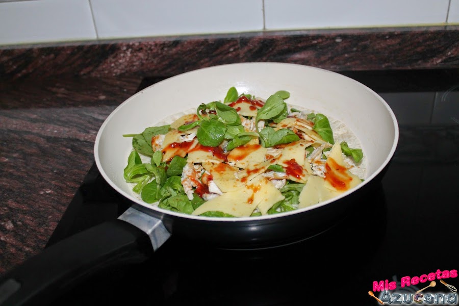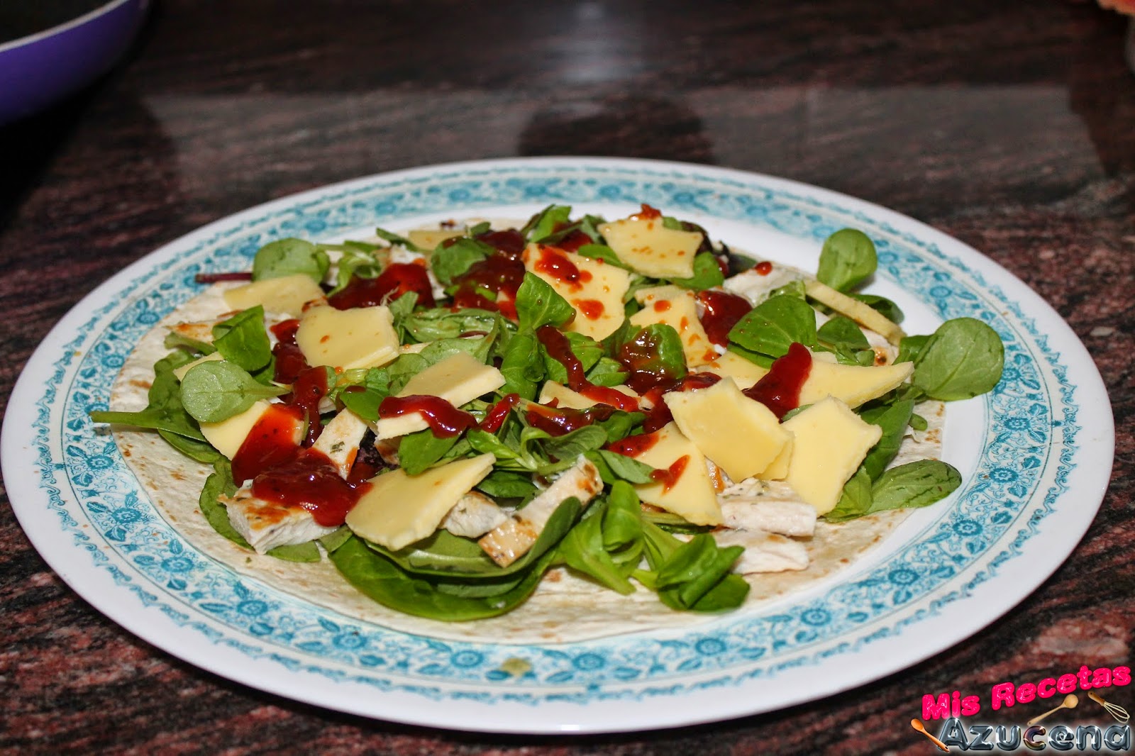 Ahora cogemos una tortita de trigo, sobre ella pondremos una capa de brotes, otra de pollo troceado y un poco de salsa barbacoa.